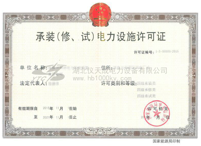 電力承裝承修承試資質許可證書,是國家電力監管委員會對于能夠對新設備安裝、設備維護和護理、設備的預防性試驗的企業頒發的資質許可證書, 取得許可證的單位依法開展活動,受法律保護。承裝類承裝(修、試)電力設施許可證等級分為一級、二級、三級、四級和五級。只有獲得各級資質才能從事各級的承裝、承修、承試電力設施活動。