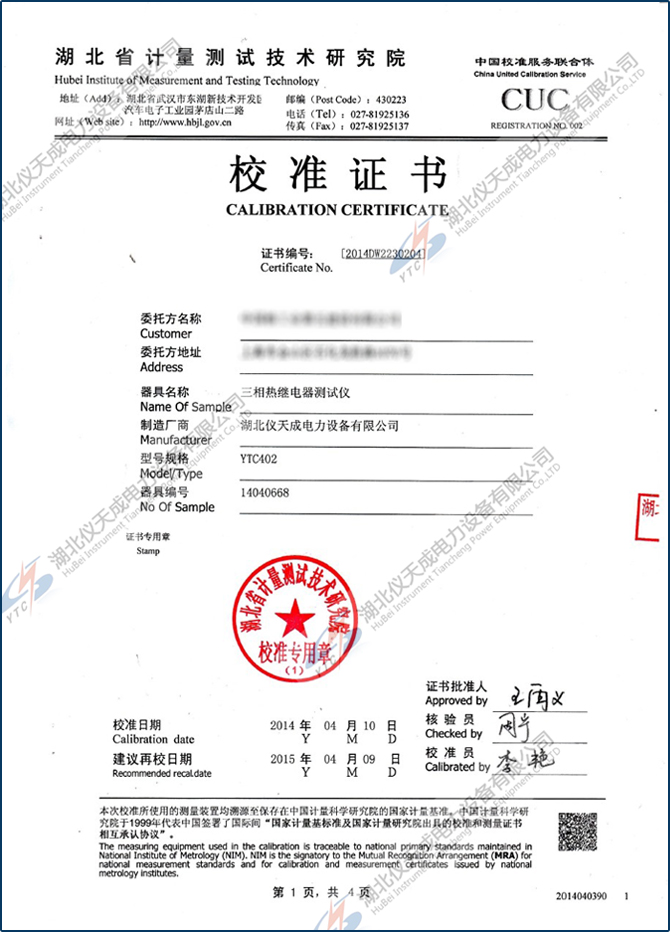 轉載:"YTC402三相熱繼電器測試儀鑒定證書" 請注明來源于儀天成電力。 更多技術問題請致電儀天成電力客戶服務:027-87876585,技術部專線:027-87876585,在線客服:719388481