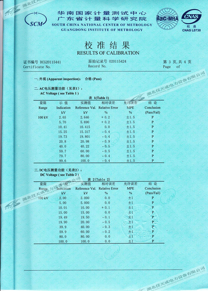 轉載:"YTC8107-100電容分壓器高壓測量系統的資質證書" 請注明來源于儀天成電力。 更多技術問題請致電儀天成電力客戶服務:027-87876585,技術部專線:027-87876585,在線客服:719388481